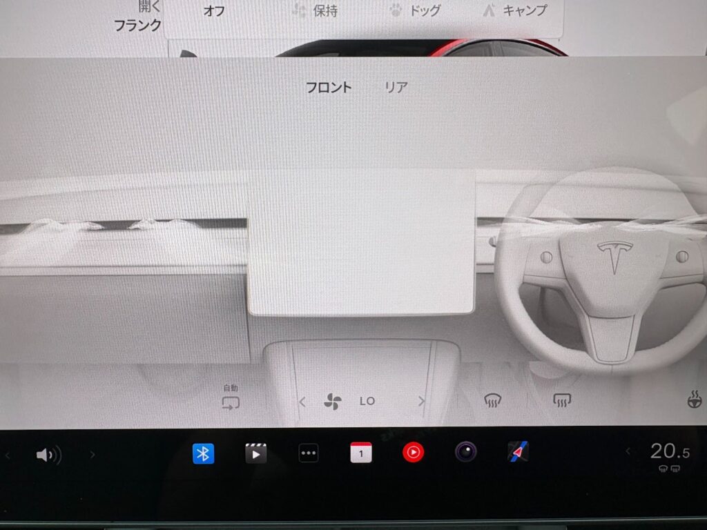 一般的な車にある、プラスチックのレバーやツマミは、テスラのダッシュボードには一切存在しません。吹き出し口は細いスリット状に隠されており、風の向きさえも15インチのメインモニターで操作します。                                      画面下部の温度表示をタップすると空調メニューが現れます、画面上にシミュレーションされている「空気の流れ」を、スマホの写真を見る時のように指でピンチ(広げたり狭めたり)したり、上下左右にスライドしていただくことで風向きが変わります。                   指先ひとつで風を二つに割って顔を避けたり、逆にピンポイントで手元を冷やしたりと、自由自在にコントロール可能です。目に見えないはずの風を、まるで自分の手で操るような感覚は、テスラならではの「未来の操作体験」と言えます。もちろん運転席と助手席で個別に風向きや温度を設定できるため、お互いに一番心地よい空間を保つことができます。沖縄の強い日差しの中でも、このスマートな空調システムがあれば、車内は常に快適なリゾート空間に変わります。