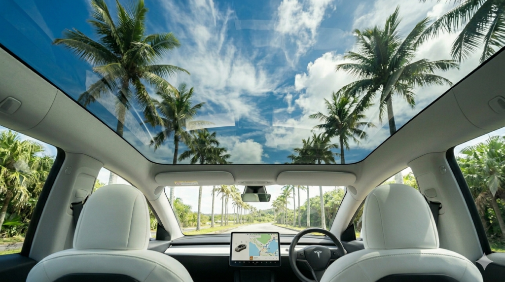 テスラに装備された全天候型パノラマガラスルーフは、単なる車の天井ではありません。